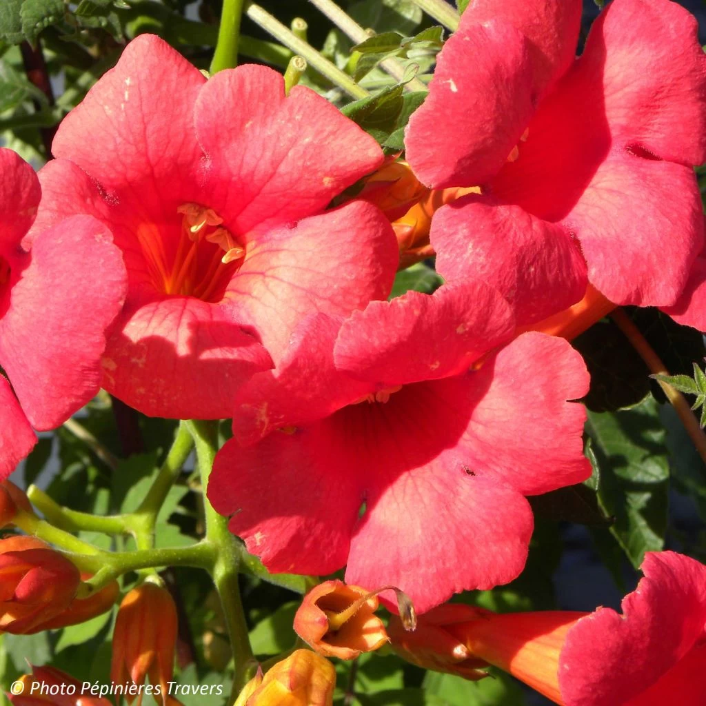 Habituellement de couleur rouge orangé, les fleurs de Bignone exhibent chez les nouveaux cultivars des teintes orange saumoné ‘, ou rouge vif ‘ du plus bel effet dans un jardin.