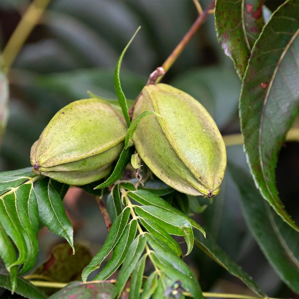 Le pacanier, en latin , est l’arbre fruitier qui produit les noix de pécan. Rustique jusqu’à -15°C, il peut être planté dans la plupart de nos régions, mais la production de fruits aura lieu essentiellement dans le Sud de la France car il a besoin d’étés chauds et longs pour fructifier. Il offre ses noix au bout de 4 à 5 années de culture. A vous alors les brownies, les tartes, ou les gâteaux aux noix de pécan ! C’est un grand arbre fruitier à coque ancré sur de profondes racines, qui peut mesurer de 20 à 40 m de hauteur, mais il existe des variétés au développement plus modeste adaptées à des jardins plus petits telles que ‘ ou. Il forme un arbre robuste, à l’ombre dense et ses grandes feuilles pennées prennent une belle teinte dorée à l’automne avant de chuter. Sa belle écorce sillonnée et sa floraison printanière en longs chatons verdâtres sont d’autres de ses attraits. Il réclame un sol profond, frais à humide et de texture légère. Partiellement auto-fertile, il est conseillé de planter deux pieds pour s’assurer un bon rendement.